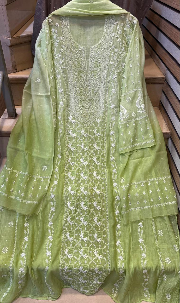 Designed in pure mulchanderi, this semi-stitched kurta set features handwork in sequins and katdana. Light and luxurious, ideal for those looking for festive dresses with refined detailing.