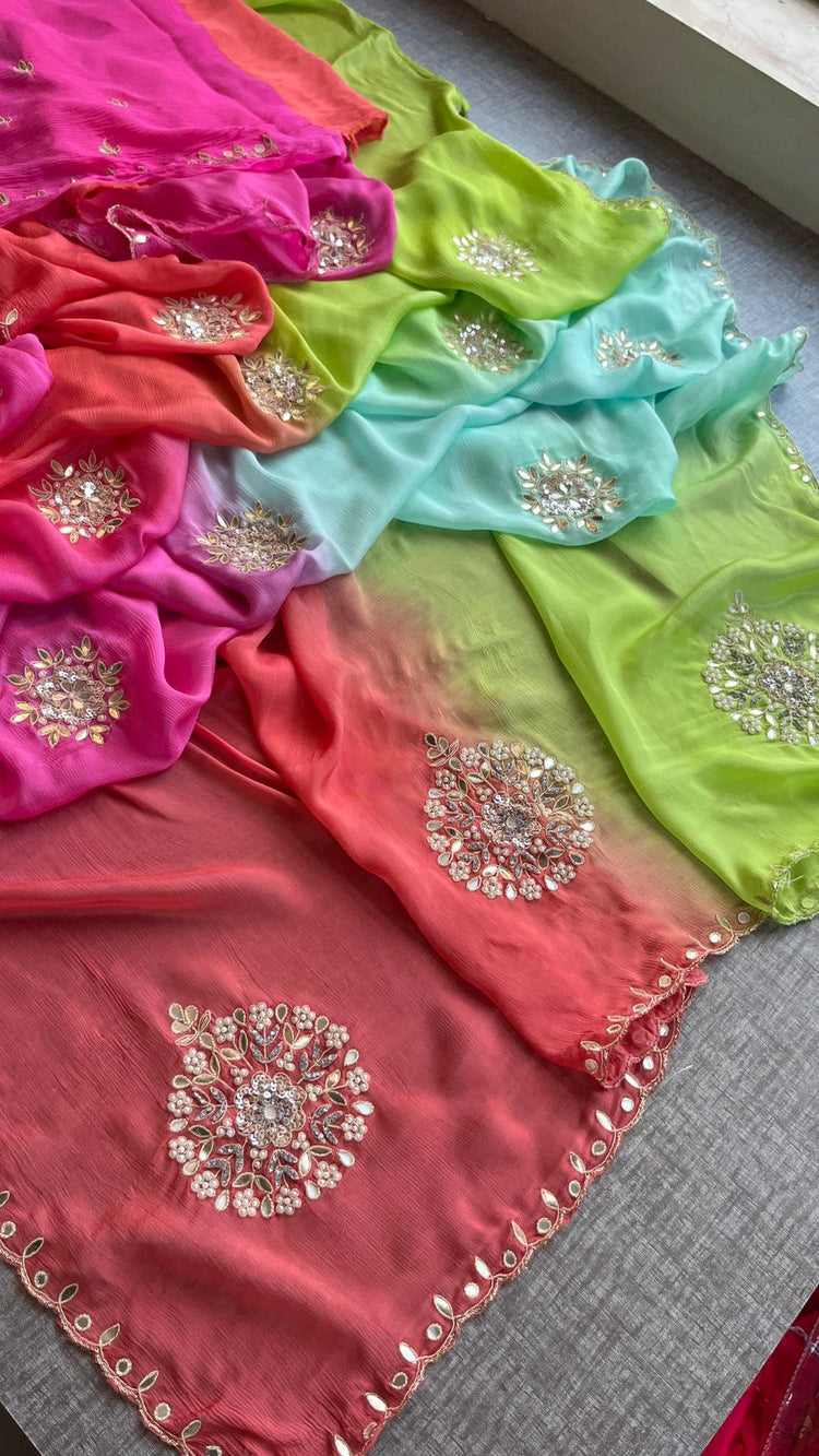 This exquisite saree is crafted from 100% pure Chinon crepe, featuring intricate Zardozi, pearl, sequins, and gotapatti work. Paired with a matching Chinon crepe blouse, this saree combines traditional craftsmanship with modern elegance, perfect for any festive or formal occasion. (NM001).