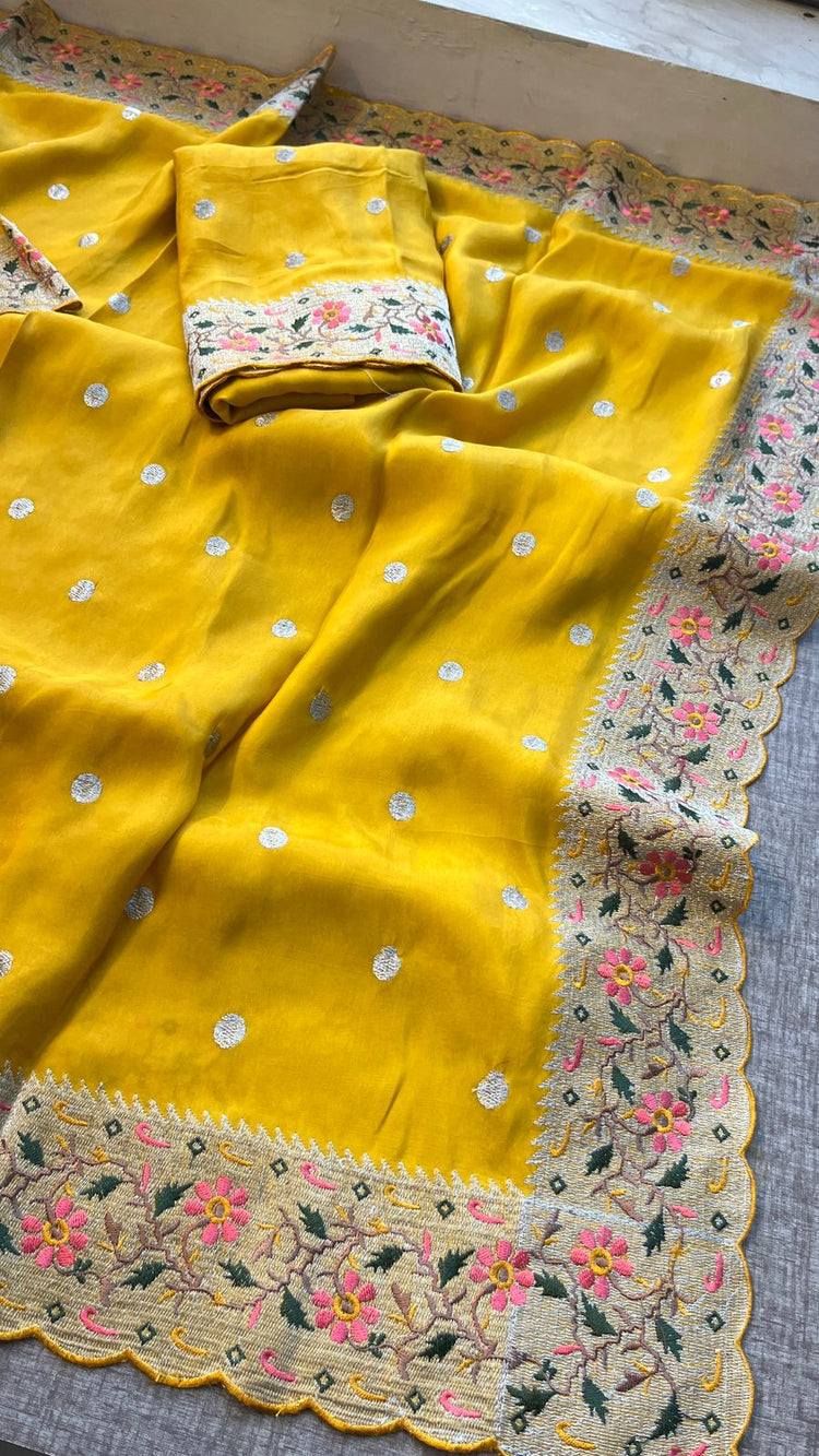 Crafted from 100% pure Munga silk, this saree is adorned with intricate multi-thread embroidery and elegant zari work, creating a timeless look perfect for special occasions. Paired with a matching pure Munga silk blouse, it offers a sophisticated blend of tradition and luxury (NM001).