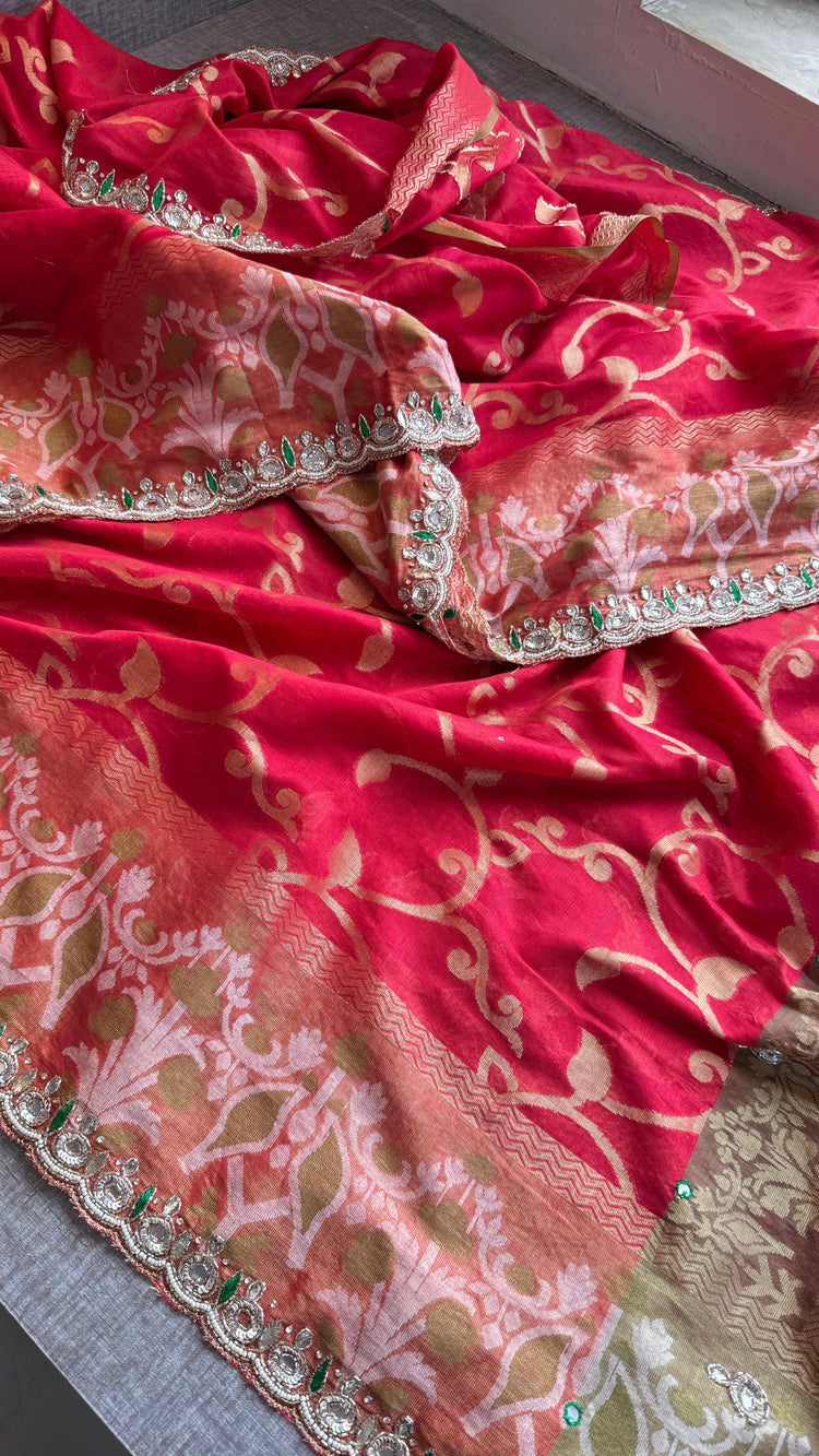 This artistic traditional silk saree is made from Kora Patola silk and showcases fine Banarasi weaving enhanced by zardozi, anchor, sequins, and gotapatti work. A standout choice for poojas, receptions, and bridal festivities.