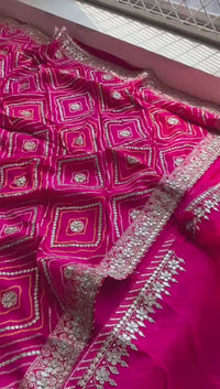 Beautifully adorned with handcrafted Gotapatti, Zardozi, and pearl embroidery, this saree shines with refined grace. Its grand border work and striking texture make it an exceptional choice for festive occasions, weddings, and celebrations where sophistication meets culture. Paired with a matching pure Munga silk blouse, this saree is a timeless addition to every connoisseur’s wardrobe.