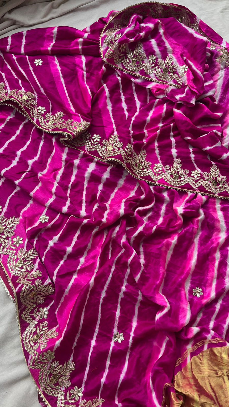 Crafted in luxurious pure Gajji silk, this classic leheriya saree is embellished with hand-done gotta patti, zardozi, and pearl embroidery. A graceful addition to your wedding saree or festive collection.