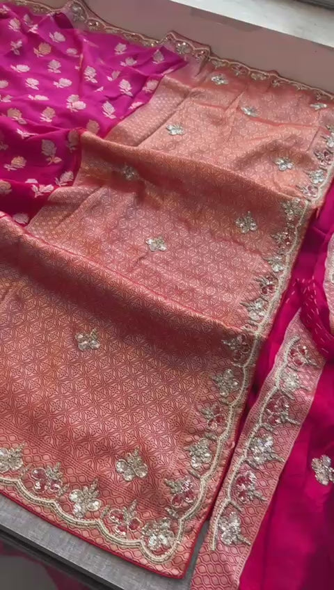 A symbol of sheer elegance and regal artistry, this Rani Pink and Coral Orange Pure Munga Silk Banarasi Saree weaves together the heritage of Banaras with modern sophistication. The rich silk fabric shimmers with intricate Banarasi motifs, while its dual-tone palette exudes festive radiance — a true heirloom creation for weddings and grand occasions.