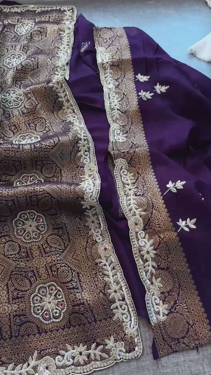 This Pure Munga Silk Banarasi Saree is the epitome of regal luxury and fine craftsmanship. Drenched in a deep royal purple hue, the saree exudes elegance through its rich Banarasi weaving, accentuated by intricate Zardozi, sequins, pearls, and premium stone work.