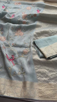 Adorned with exquisite multi-thread and zari embroidery, the saree showcases ornate floral motifs in gold, copper, and blush tones, delicately scattered across the body. The borders are finished with fine zari-edged scallops, lending the piece a refined grandeur. Perfect for wedding functions, festive celebrations, and elegant soirées, this saree is a symbol of artistry and heritage that transcends trends.