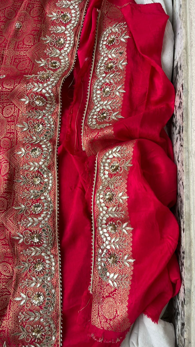 This stunning pure silk saree showcases the timeless beauty of Ghatchola weaving, enriched with intricate handwork details. The luxurious drape features gota work, zardozi, and shimmering sequins, making it a perfect choice for a wedding saree or any grand occasion.