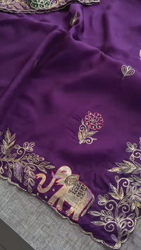 Experience luxury in every drape with this exquisitely crafted Pure Soft Munga Silk Saree, adorned with rich handcrafted detailing. The saree features an intricately embroidered scalloped border with Kasab, Cutdana, Resham & Sequin work, highlighted by heritage motifs including florals, peacocks and traditional elephant detailing.