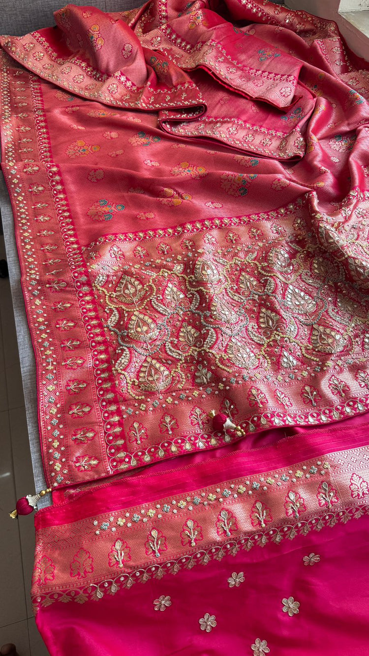 Rose Coral Pure Soft Munga Silk Meena Banarasi Saree with Handcrafted Zardozi Gotapatti Pearl and Sequin Embroidery