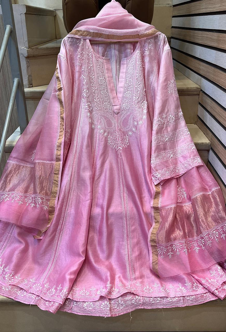 Pure Chanderi Silk Semi-Stitched Anarkali Kurta Dupatta Set