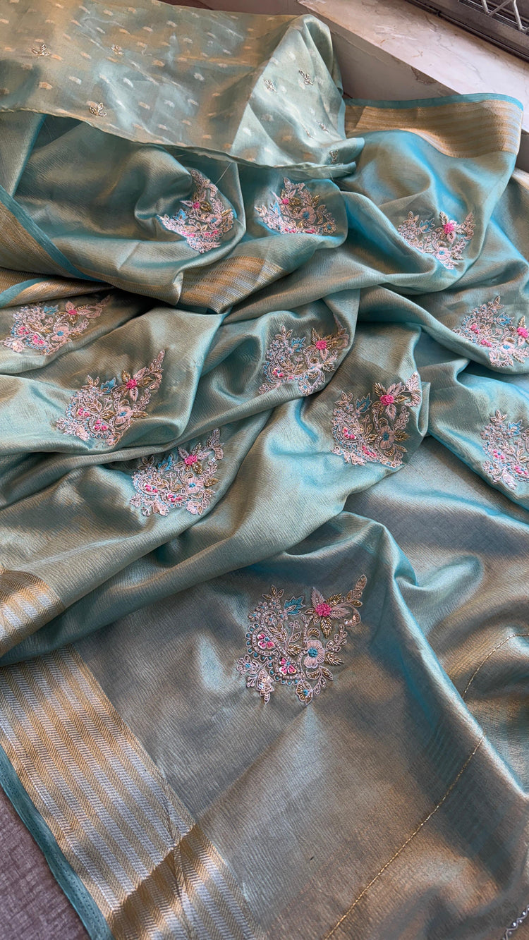 Crush Tissue Handloom Silk Banarasi Saree with Zardozi & Pearl Work