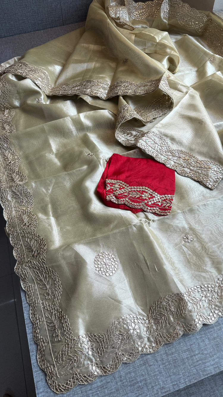This pure silk saree is a refined choice for women who love timeless elegance. Crafted from 100% pure tissue handloom silk and paired with a pure Munga silk blouse, it is adorned with intricate gotapatti and sequins work. Perfect as an Indian wedding saree or festive ethnic wear for women, it reflects the richness of traditional silk sarees and authentic craftsmanship.