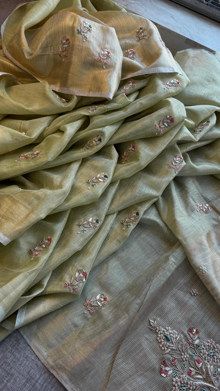 Tissue Linen Banarasi Silk Saree with Zardozi & Pearl Work
