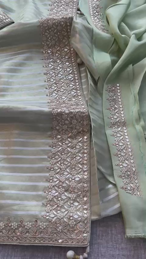 Featuring a luminous striped texture with intricate handcrafted detailing along the borders, the saree is beautifully enhanced with gotapatti, zardozi, pearl, sequins, and anchor work. The delicate embroidery creates a graceful floral pattern, adding richness without overpowering the design.
