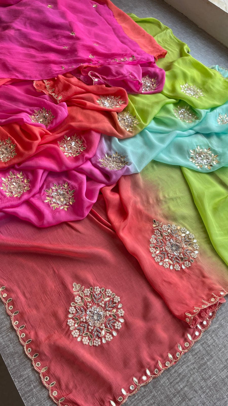 This exquisite saree is crafted from 100% pure Chinon crepe, featuring intricate Zardozi, pearl, sequins, and gotapatti work. Paired with a matching Chinon crepe blouse, this saree combines traditional craftsmanship with modern elegance, perfect for any festive or formal occasion. (NM001).