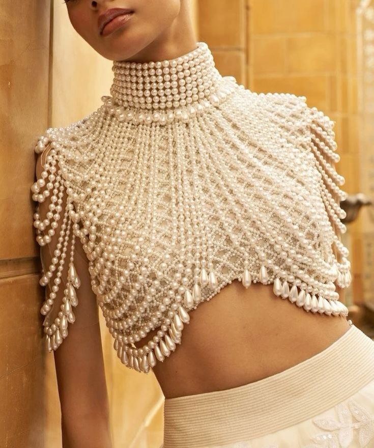 This isn’t just a blouse—it’s a statement. Pair it with sarees, lehengas, or flowy skirts to create an iconic look that turns heads at weddings, receptions, and high-profile events. Every pearl is a testament to elegance, designed to let you shine like the star you are.