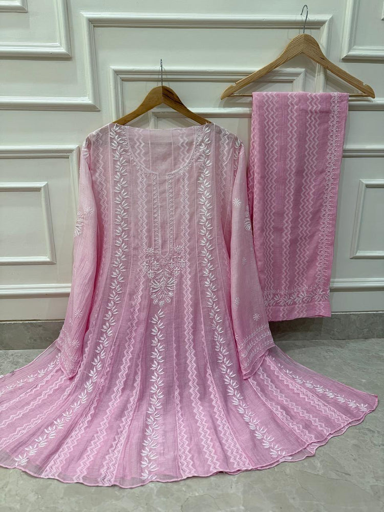 This pure mul chanderi jacquard co-ord set features a flared semi-stitched kurta with matching pants. Embellished with fine sequin and katdana work, it’s a sophisticated outfit for party lovers or fans of ethnic suits for women.