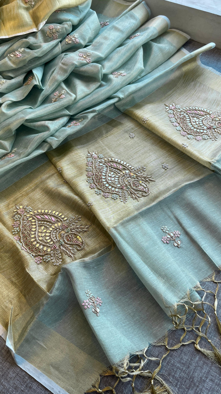 Tissue Linen Banarasi Silk Saree with Zardozi & Pearl Work